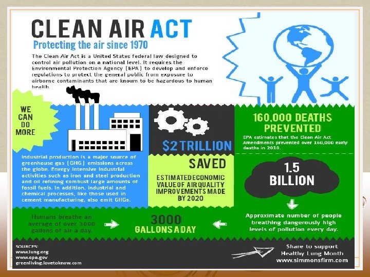 AIR POLLUTION v Approximately 14 million metric tons of air pollution are released annually into the atmosphere in the US by human activities. v Worldwide emissions total around 2 billion metric tons. Cunningham - Cunningham Saigo: Environmental Science 7 th Ed.
