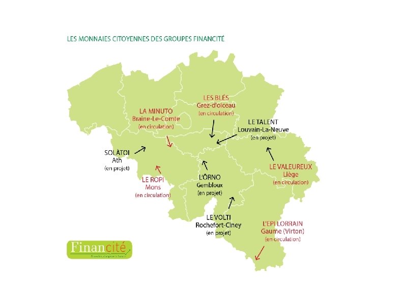 2. 3 Les monnaies citoyennes dans nos contrées Rassemblées au sein du Réseau Financité, il existe depuis 2012 une dizaine de projets de monnaies citoyennes à Bruxelles et en Wallonie. En 2016, 5 projets ont vu le jour et 7 sont en cours : - Les épis en Gaume, les ropis à Mons-borinage, les blés dans le Brabant, les minutos à Braine-le-Comte et les Valeureux à Liège. - Projets dans les régions de Tournai, Gembloux, Rochefort-Ciney, Namur, Ath, Louvain-la-neuve, Stavelot. Objectifs : Favoriser les circuits courts (producteurs-consommateurs), relocaliser l'économie et soutenir un développement ; remettre le citoyen au coeur des débats et prises de décisions, notamment sur la finance et la question monétaire ;