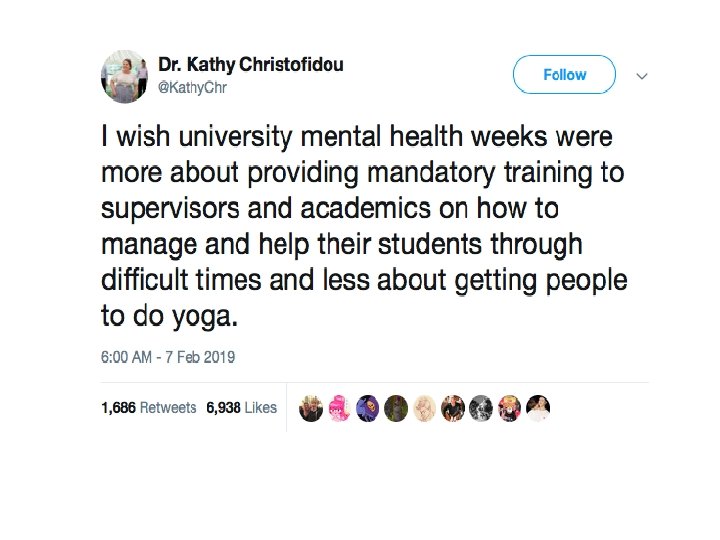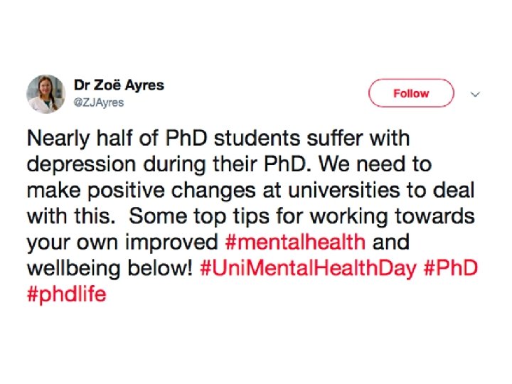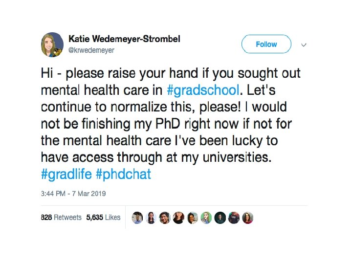 What can we do? • Pay attention to language – awareness of the words we use that contribute to stigmatizing mental issues • Rethink “sick days” – the mental health day is real • Tap the Wellness Resources – acupuncture, exercise such as walking, bicycling, swimming, tennis, and anything that will keep you moving. • Get help early. The sooner you get help, the sooner you will bounce back. • Don't be afraid to tell your fellow students or colleagues, especially those close to you. • Talk to your advisor and let them know what is going on. • Have more discussions - a start to removing stigma. • Talk about your feelings. - It's a release valve. You will be stronger for it. • Educate faculty who encourage unhealthy work habits Basic human understanding and compassion