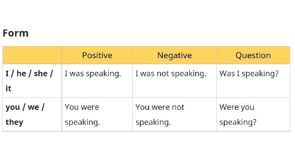 Form Subject I He She It We You They Verb to be in past was were verb-ING Working Drinking Watching Talking Having fun Studying laughing
