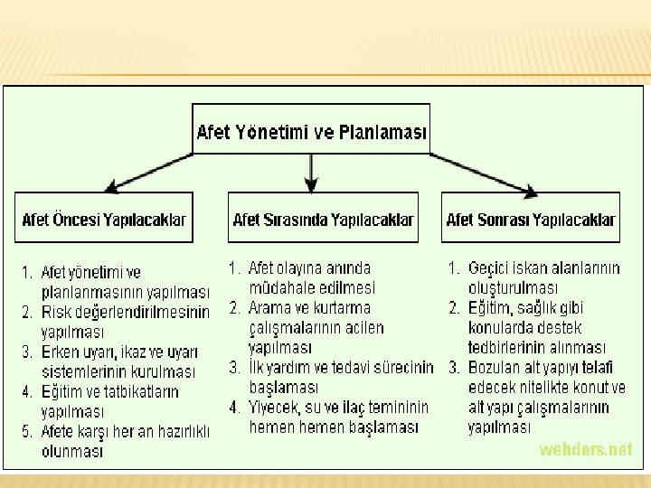 AFET YÖNETIMI VE PLANLAMASI � İnsanlık tarihi boyunca yaşanan doğal afetler, bugüne kadar büyük can ve mal kayıplarına neden olmuştur. Doğal afetlerin çoğunun önceden tahmin edilmesi ve önlenmesi mümkün değildir. Afete neden olan doğa olaylarını iyi tanımak, oluşumlarını önceden tespit et mek için yeterli çalışmaları yapmak gerekir. Afetin zarar larını azaltmak için o bölgenin yetkili kurulları afet yöne timi ve planlaması ile ilgili çalışmalar yapmak zorunda dır. Aşağıda afet öncesinde, afet sırasında ve afet son rasında alınması gereken bazı çalışmalar verilmiştir