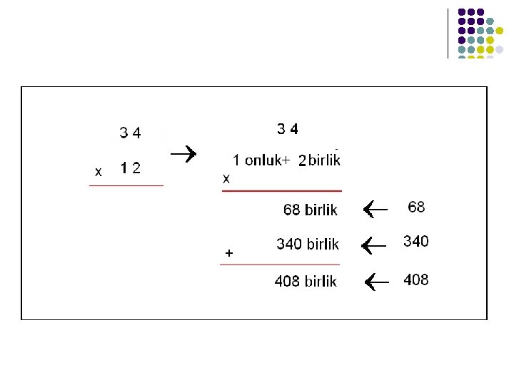 Çarpma İşlemi Çarpma işleminin öğretimini basamak kavramına dayalı olarak gerçekleştirirken birlik kere birlik , birlik l birlik kere onluğun onluk l onluk kere onluğun yüzlük l olduğu, olduğu kavratılmalıdır. Buradan basamak kavramına dayalı ve çarpmada işlem tekniğini kavratmaya dönük çalışmalara geçilir.