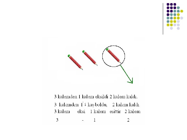l l l Sayı içinde çıkarma işlemlerine yer verilir. 5 -1=4 5 -2=3 5 -3=2 5 -4=1 5 -5=0