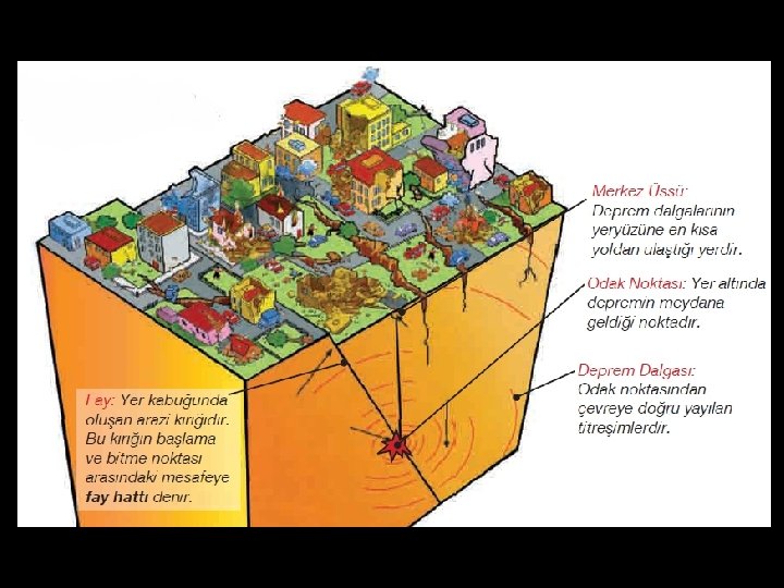 Depremle ilgili kavramlar: � � Volkanik depremler: Ateş kürede bulunan magmanın yeryüzüne çıkışı sırasında, fiziksel ve kimyasal olaylar sonucunda oluşan gazların sebep olduğu patlamalar depremleri meydana getirir. Bu tip depremlere volkanik depremler denir. Çöküntü depremler: Yeraltındaki boşluklarda (mağaralarda), kömür ocaklarında tavanların çökmesi ile oluşan depremler, çöküntü depremleridir. Depremlerin oluşumunu, ölçü aletlerini, ölçme yöntemlerini ve deprem ile ilgili diğer konuları inceleyen ve değerlendiren bilim dalına sismoloji (deprembilim), bu alanda çalışan bilim insanlarına ise sismolog (deprembilimci) denir. Tsunami: Deprem, volkan patlaması ya da toprak kayması gibi yer hareketleri, deniz tabanında alçalmaya ya da yükselmeye neden olur. Bu süreçte oluşan dev deniz dalgalarına Tsunami adı verilir. Dalgaların hızı 950 km/h ye kadar çıkabilir. Kıyıya yaklaştıkça dalgalar yavaşlar, ancak yüksekliği artar.