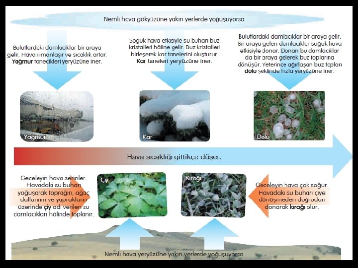 Nem: � Havada bulunan su buharı havanın içerdiği nem miktarını belirler. � Havadaki nem miktarı havanın bulunduğu yere ve sıcaklığa göre değişir. Havanın sıcaklığı arttıkça havadaki nem miktarı da artar. � Soğuk havada nem yoğuşacağı için sıcak havaya oranla soğuk hava daha az nem içerir. Nemli hava yükselirken sıcaklığın düşmesiyle soğur ve bu durumda havadaki nem de yoğuşarak su damlacıkları haline gelir.