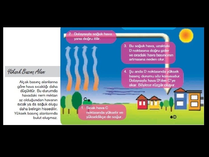 Çok küçük su damlacıklarının yoğuşmasıyla oluşan yüzey bulutlarına sis denir. Yükseklerdeki bulutlar havanın soğumasıyla oluşurken sis soğuk olan yeryüzünün hemen üzerindeki havada bulunan su buharının yoğuşmasıyla meydana gelir. Hava Olaylarının Sebebi � Belli bir alanın üstündeki havanın normalden daha fazla sıkışması ile oluşturduğu basınç, yüksek hava basıncıdır. Bunun tersi olarak havanın normalden daha seyrek olması hâlinde yaptığı basınç ise alçak hava basıncıdır. � Atmosferdeki alçak ve yüksek basınç alanları sıcaklık farklılıklarından ortaya çıkar. Isınan hava yükselir ve havayı oluşturan tanecikler daha soğuk alanlara doğru giderek oralarda birikir. �