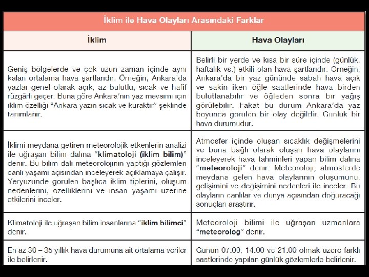 3. Sıcaklık Farkından Kaynaklanan Hava Olayları � Hava koşulları, Dünya’nın Güneş ışınlarını alma durumuna ve hava küreyi oluşturan maddelere bağlıdır. � Günden güne ve bölgeden bölgeye değişen bir özelliğe sahip olan hava olaylarını sıcaklık, yağış, rüzgâr, nem ve hava basıncı gibi değişik etkenler belirler. Özellikle rüzgârlar, atmosferdeki havanın Dünya çevresindeki hareketini kolaylaştırdığından hava olaylarını belirlerken oldukça önemlidir.