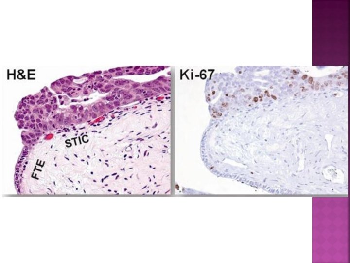 • BRCA 1 mutasyonu taşıyan kadınların tubalarında % 5 -10 oranında“Seröz Tubal Intraepitelyal karsinom” (STIC) saptanıyor. • Bunların % 80’i fimbria yerleşimli • Sporadik over karsinomlarında da % 50 -60 oranında tuba epitelinde “STIC” saptanmış. • Pelvik seröz karsinomlarda tubal mukoza lezyonu % 50’den fazla • Over yüksek dereceli seröz karsinomlar ve STIC lerde benzer p 53 mutasyonu