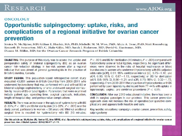 Effectiveness of Risk‐Reducing Salpingo‐Oophorectomy in Preventing Ovarian Cancer in a High‐Risk French Canadian Population Bacha, Omar Moreira; Gregoire, Jean; Grondin, Katherine; Edelweiss, Maria Isabel; Laframboise, Rachel; Simard, Jacques; Plante, Marie International Journal of Gynecological Cancer. 22(6): 974 -978, July 2012. doi: 10. 1097/IGC. 0 b 013 e 318257 b 936 TABLE 2 Genetic testing Copyright © 2014 International Journal of Gynecological Cancer. Published by Lippincott Williams & Wilkins. 50
