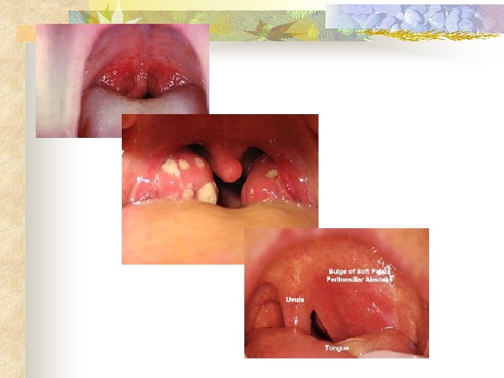 Patološke promjene 1. Kataralna upala crvenilo i edem sluznice � proziran sluzavi eksudat � 2. Eksudativna (gnojna) upala � bijeli 3. do sivožuti eksudat na tonzilama Vezikulozna (aftozna) � najprije mjehurići na crvenoj sluznici � brzo pucanje plitke sluzničke ulceracije (afte)