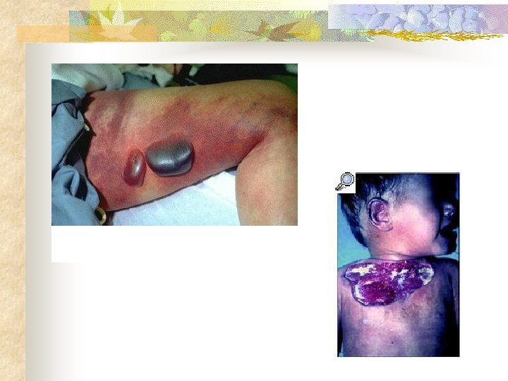 Klinička slika n U početku neznatna promjena na koži n Brzo povećanje 24 -48 sati n n Crvenilo i otok Izrazita bolnost Potom nekroza sa ljubičastim bulama Toksemija i šokno stanje n Streptokokni tosični šok sindrom