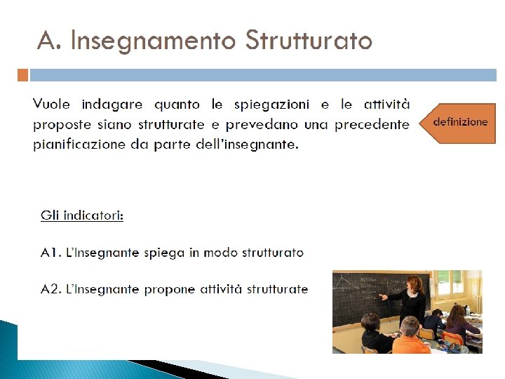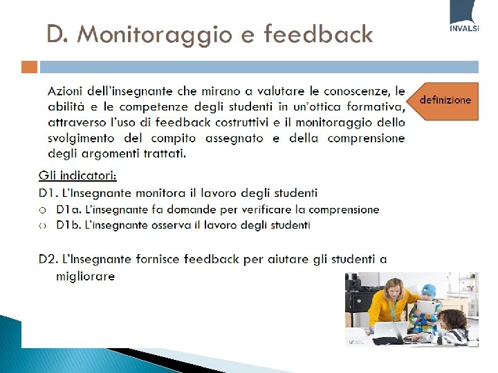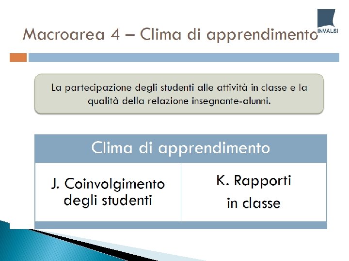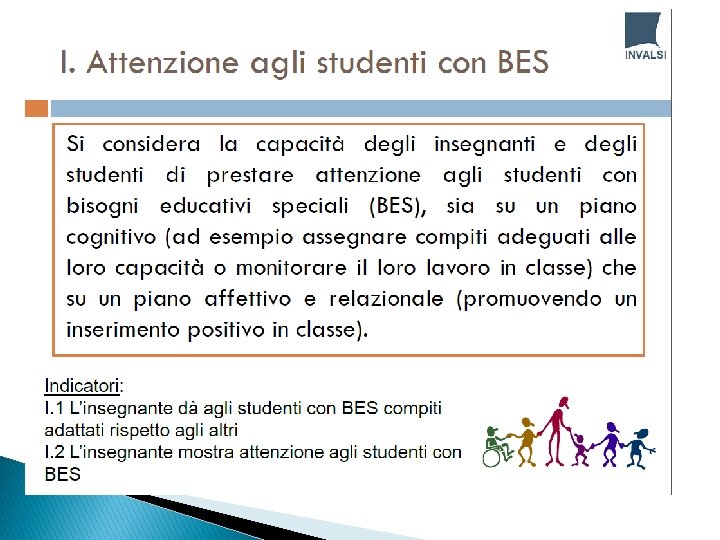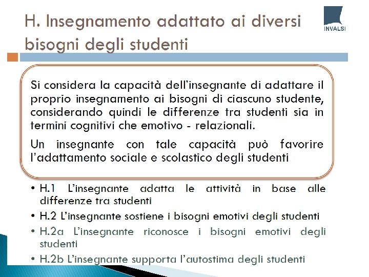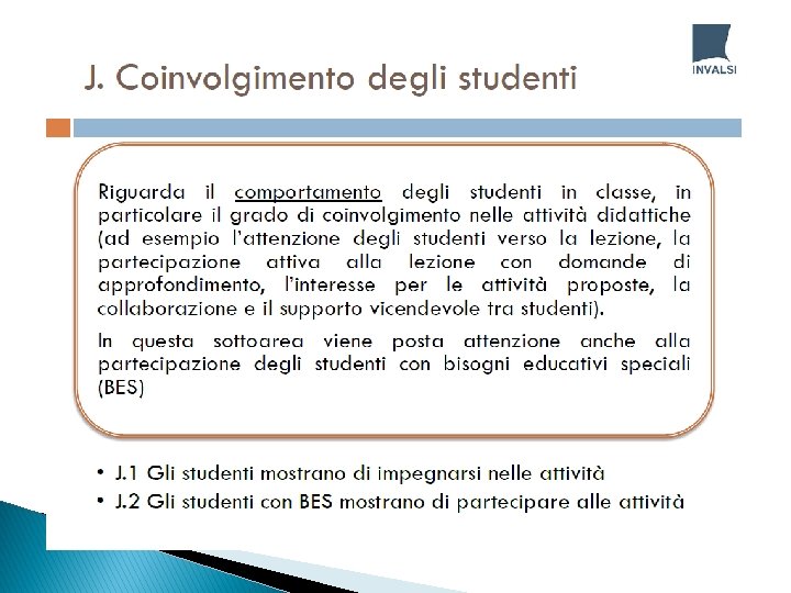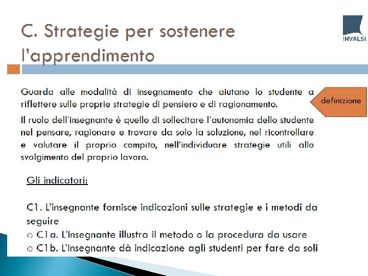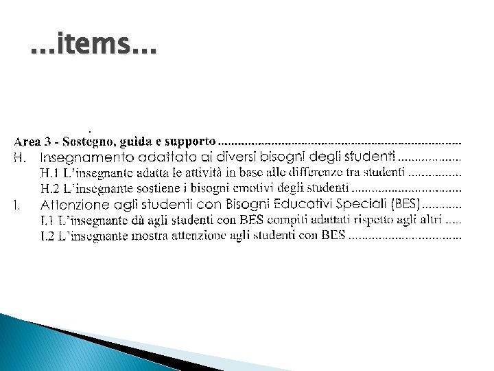 . . . 9 sotto-aree I. DIDATTICA � � � I. ORGANIZZAZIONE � � � II. PROFESSIONALITA’ � � � a) Organizzazione delle situazioni di apprendimento b) Osservare e valutare gli allievi secondo un approccio formativo c) Coinvolgere gli studenti nel loro apprendimento e nel loro lavoro d) Lavorare in gruppo tra insegnanti e) Partecipare alla gestione della scuola f) Informare e coinvolgere i genitori g) Affrontare i doveri e i problemi etici della professione h) Servirsi delle nuove tecnologie per le attività progettuali, organizzative e formative i) Curare la propria formazione continua