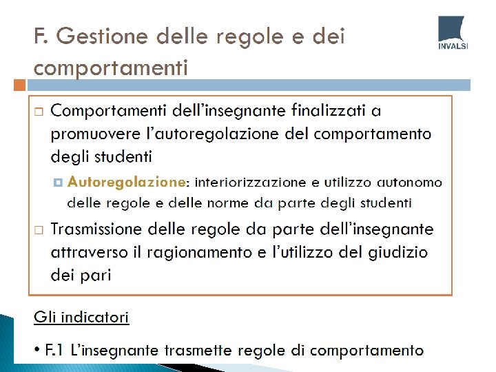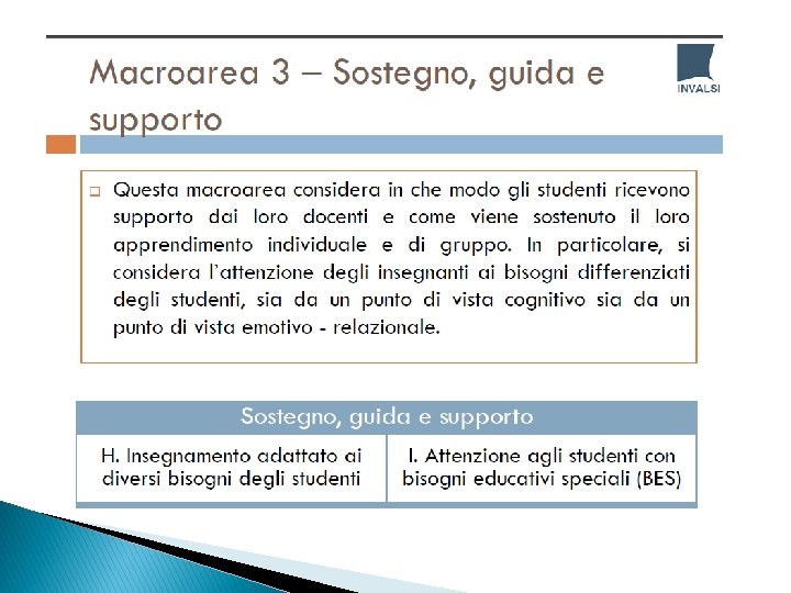 indicatori � 50 INDICATORI in totale (per le tre aree) � Lievi differenziazioni di alcuni indicatori per �Infanzia �Primaria �Secondaria di I e II grado �Sostegno � Posizionamento su 3 livelli: �“HO BISOGNO DI ACQUISIRE NUOVE COMPETENZE” �“DOVREI CONSOLIDARE ALCUNE COMPETENZE” �“MI SENTO ADEGUATO AL COMPITO”