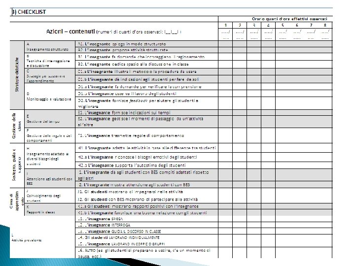checklist 1 � Un modello di insegnamento efficace” , ricerca svolta dalla Hay Mc. Ber (2000) � 1. � 2. � 3. � 4. � 5. � 6. � 7. � 8. Aspettative elevate Programmazione Metodi e strategie Gestione degli allievi/disciplina Gestione del tempo e delle risorse Valutazione Compiti a casa Concentrazione degli allievi e ritmo della lezione