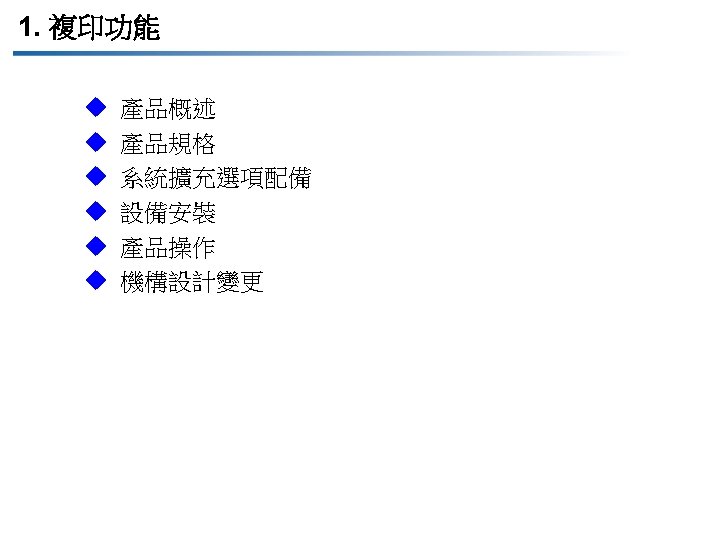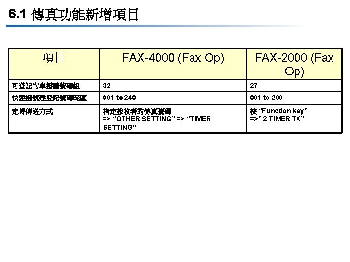 1. 5 複印操作主要差異 Items項目 DOCUJET 4016/4021 DOCUJET UA 3816/UA 3820 New control panel , panel design change 新操作面板,面板設計更新 四行LCD顯示 背光顯示 可顯示中文字幕 兩行LCD顯示 Inputting numerical values for scaling or other settings 以數字型態的數值,來輸入調整值或設 定值 上、下鍵和數字鍵盤 上鍵及下鍵 Non-standard paper size registration非 標準格式紙張登錄 支援 不支援 Account track 影印監控 50 組 20 組 支援 Legal/FLS change for original reading 讀取原稿時,FLS格式與Legal格式之間 可相互替換 不支援