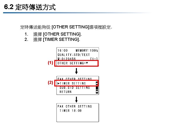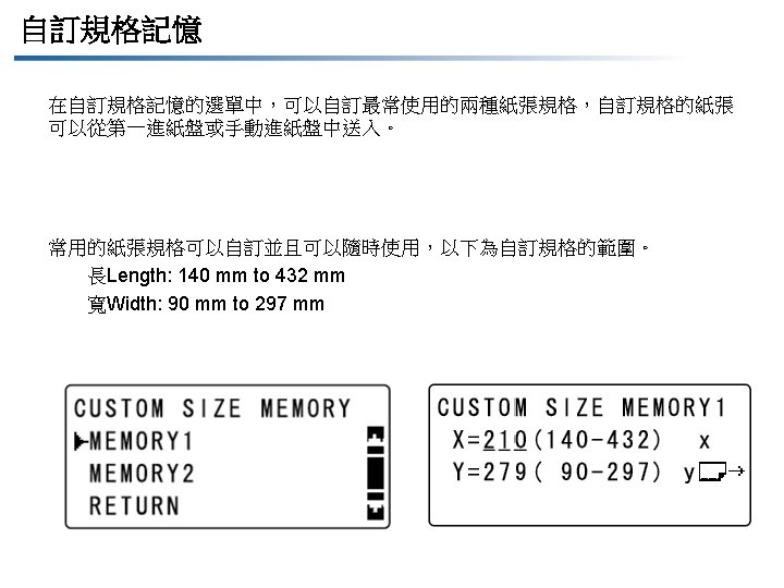 Utility Mode 實用功能模式 1 MACHINE SETTING 機器設定 AUTO PANEL RESET(面板自動重置) OFF/ 30 sec/ “ 1 min”/ 2 min/3 min/4 min/5 min ENERGY SAVE MODE(節能模式) 1 to 240 min. AUTO SHUT OFF(自動關閉) ON/OFF 15 to 240 min. DENSITY (ADF)(濃度) “MODE 1” /MODE 2 DENSITY (BOOK)(濃度) “MODE 1” /MODE 2 PRINT DENSITY(列印濃度) 5 scales LCD CONTRAST(視屏對比度) 4 scales. KEY SPEED SETTING(按鍵速度設定 ) TIME TO START: 1. 0/1. 5/2. 0/2. 5/3. 0 sec. INTERVAL: 0. 1/0. 3/0. 5/1. 0/1. 5/2. 0/2. 5/3. 0 sec. LANGUAGE(語言) ** BUZZER VOLUME(蜂鳴器音量) ** INITIAL MODE(初始模式) PAPER SOURCE SETUP 紙張來源設 定 • SCAN THRESHOLD (掃描記憶體最小值(門檻)) 256/512/1024/1536 K byte 設定記憶體不足警告值;當剩餘記憶體少於設定值時,機器將 會發出警告 “MEMORY NEAR FULL”。 INCH/METRIC(英制/公制) INCH/METRIC TRAY 1 PAPER(第一紙匣) PAPER SIZE: “AUTO” /SIZE INPUT/POSTCARD/MEMORY 1/MEMORY 2 MEDIA TYPE: “PLAIN” TRANSPARENCY CARD ENVELOPE PAPER TYPE(紙張種類) “PLAIN” /RECYCLE/SPECIAL/1 -SIDE * 當有安裝NC-503 or IC-206時才會顯示 ** 當有安裝 FK-4000時才會顯示