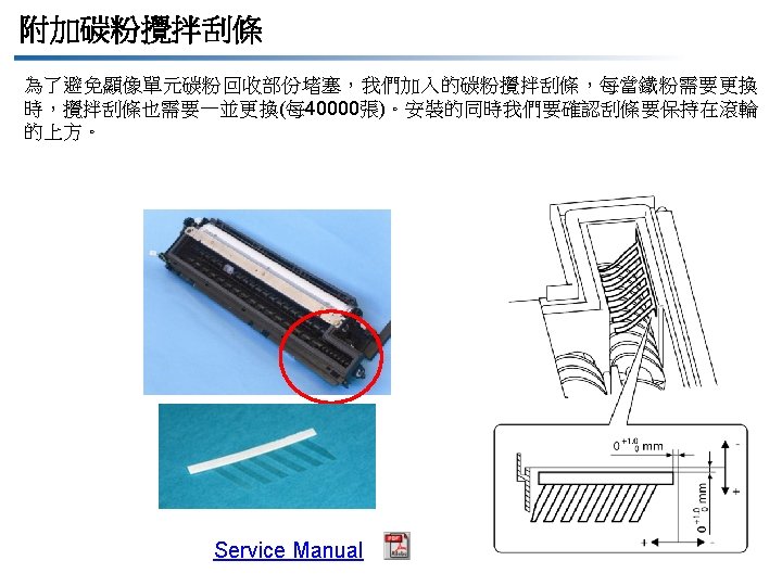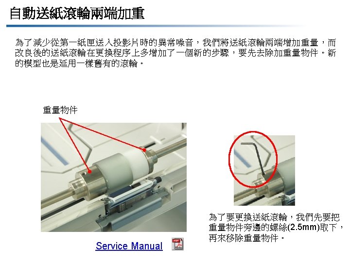 1. 6 機構設計變更 Items 項目 Contents 包含 Changes 改變 Reasons for changes 改變原因 Control panel 控制面板 Usability improvement 實用功能增加 Front cover 前蓋 Shape change due to the control panel shape change 前蓋外型因為配合新控制面板而更動 Left cover 左側蓋 Shape change due to the discontinued parallel port 左側蓋因為配合平行埠的移除而更動外型 Weight addition to both ends of the feed roller 自動送紙滾輪兩端加重 Change due to reduce abnormal noise for OHP transparencies 因為使用投影片時會產生異常噪音所以更動設計 Change the procedure of replacement for it 為此也改變了更換滾輪的步驟 Transfer roller change 轉寫滾輪變更 Change due to the discontinued transfer roller production by the current vendor 由於原本轉寫滾輪的供應商停止生產,所以更動 Toner agitating seal addition 附加碳粉攪拌刮條 To prevent the toner recycling section in the developing unit from getting clogged 為了避免顯像單元碳粉回收部份堵塞結塊 Rear side board related parts 後側相關零組件 Printer Control Board(PRCB) MFB Board (MFCB) Fax Board, NCU Board NIC Mounting plate