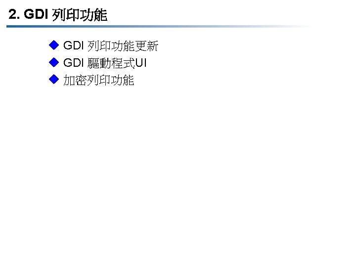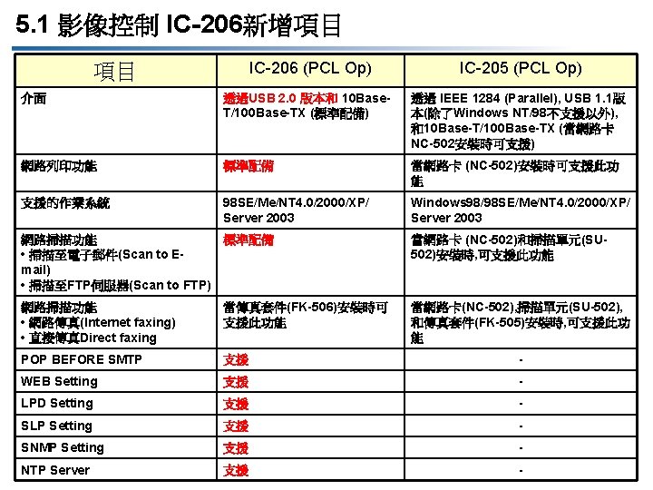 2. 1 GDI 列印功能更新 Items DOCUJET 4016/4021 (GDI) DOCUJET UA 3816/UA 3820 (GDI) Interface 傳輸介面 Compliant with USB Revision 2. 0 and 10 Base-T/100 Base-TX (Available when NC-503 is installed) Compliant with IEEE 1284 (Parallel), USB Revision 1. 1 (Execept for Windows NT/98), and 10 Base-T/100 Base-TX (Available when NC-502 is installed) Supported OS 支援作業系統 98 SE/Me/NT 4. 0/2000/XP/ Server 2003 Windows 98/98 SE/Me/NT 4. 0/2000/XP/ Server 2003 Secure Print 加密列印功能 經由 GDI and PCL 驅動程式皆可使用 只能以PCL驅動程式使用