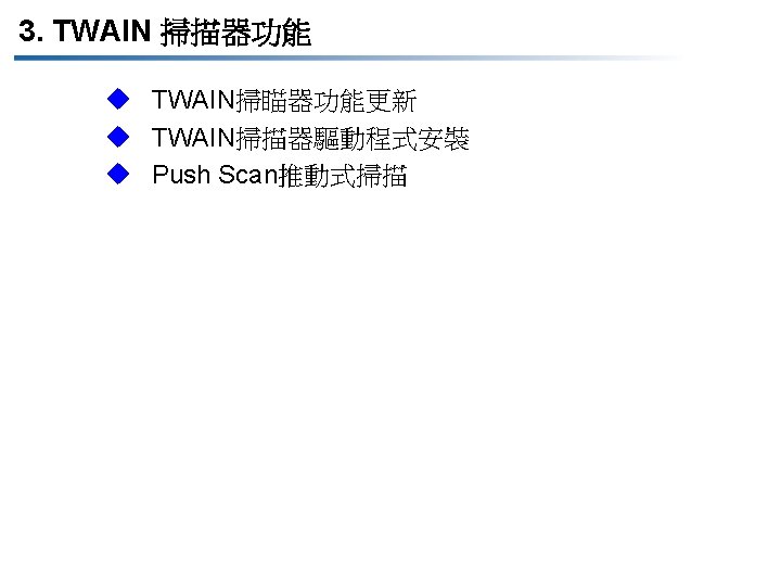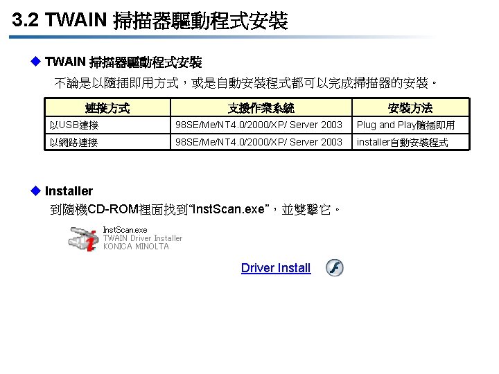 3. 1 TWAIN 掃描器功能更新 項目 DOCUJET 4016/4021 (TWAIN) DOCUJET UA 3816/UA 3820 (TWAIN) Interface 傳輸介面 Compliant with USB Revision 2. 0 and 10 Base-T/100 Base-TX Available when NC-503 or IC-206 is installed) Compliant with USB Revision 1. 1 (Except for Windows NT 98) Driver installation method 驅動程式安裝方式 Plug and Play/Installer (隨插即用/自動安裝程式) Plug and Play (隨插即用) Scan method 掃描方式 Pull Scan/Push Scan (拉/推動式掃描) Pull Scan (拉動式掃描)