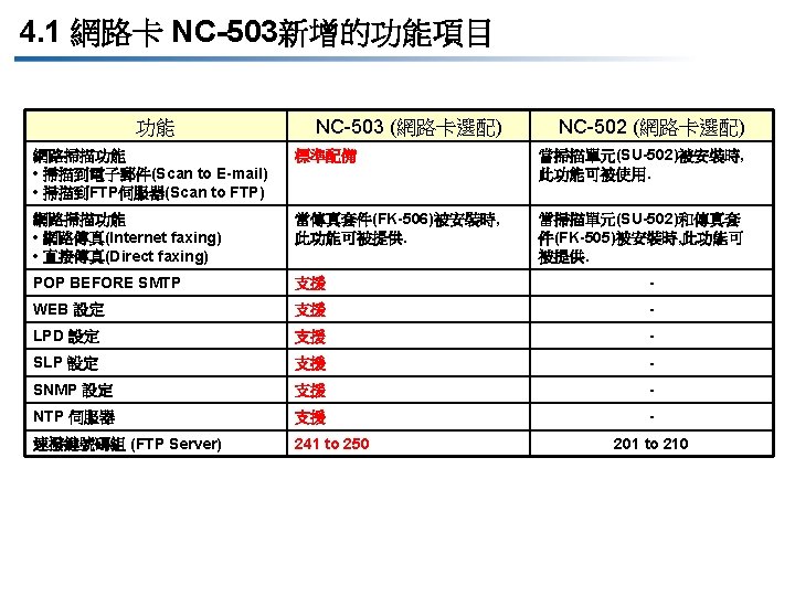 4. 網路卡 NC-503 u u u u 網路卡 NC-503所提供的新增功能 POP BEFORE SMTP WEB Setting LPD Setting SLP Setting SNMP Setting NTP Server