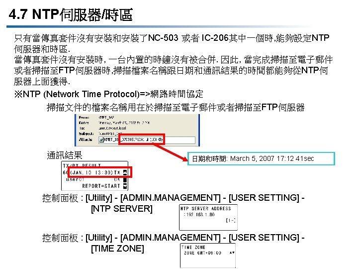 4. 2 POP BEFORE SMTP u 支援 POP BEFORE SMTP 當發送電子郵件時, POP BEFORE SMTP的驗證能夠使用. 控制面板 : [Utility] - [ADMIN. MANAGEMENT] - [E-MAIL SETTING 1] [POP BEFORE SMTP] PSWC : [Admin Mode] - [Network] - [SMTP & POP 3 Configuration] - [Enable POP before SMTP Client PC Server POP被使用為用戶驗證