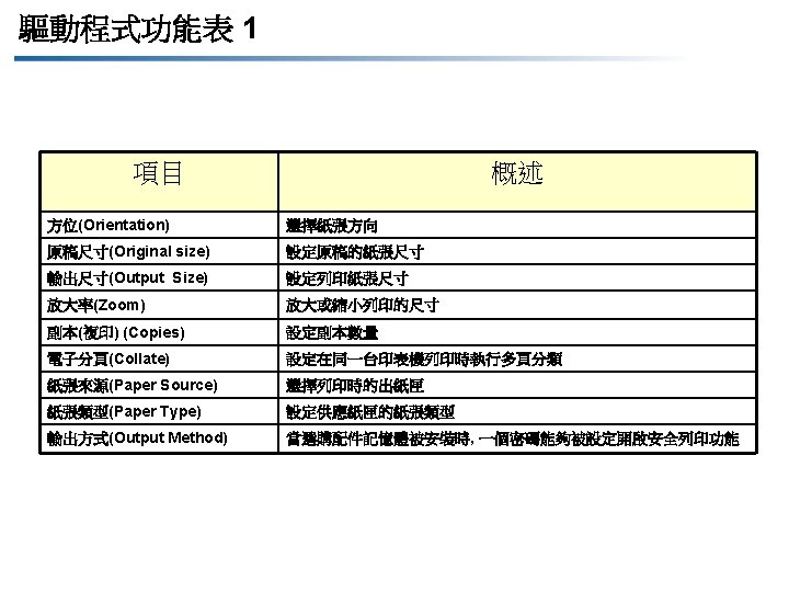GDI驅動程式功能列表 1 項目 略述 Orientation(方位) Selects paper orientation(選定紙張方向) Original size(原稿尺寸) Sets the paper size for the original(設定原稿文件尺寸) Output Size(輸出尺寸) Sets print paper size(設定輸出紙張尺寸) Zoom(放大率) Increases or decreases the size for printing(縮放列印尺寸比例) Copies(複印) Sets the number of copies(設定複印數量) Collate(分頁) Sort multiple pages to one set to be printed(自動分頁) Paper Source(紙張來源) Selects the paper feed tray for printing(選定紙張來源) Paper Type(紙張類型) Sets the paper type on the feed tray(設定進紙匣紙張種類) Output Method(輸出方式) When the optional memory is installed, a password can be set to turn on the secure print function(裝上外加選購記憶卡後,加密列印 功能就可以使用了)