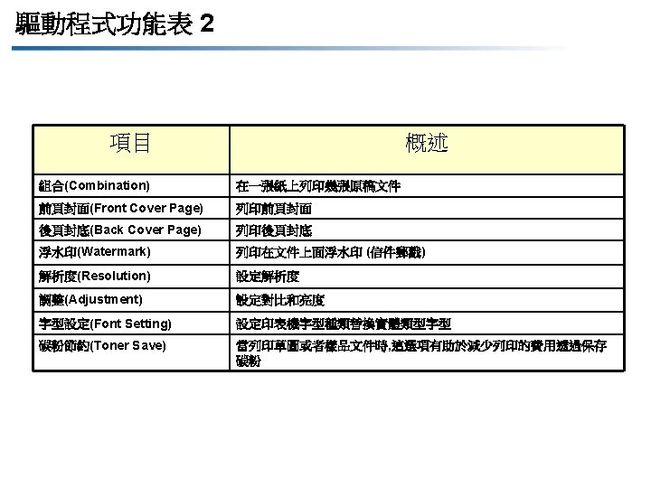 GDI驅動程式功能列表 2 項目 略述 Combination(組合) Prints several pages of original on one sheet of paper(列印多合一文件) Front Cover Page(前頁封面) Prints with the front cover page(列印前頁封面) Watermark(浮水印) Prints watermark (letter stamp) over the document(列印浮水印在文件上 ) Resolution(解析度) Sets resolution(設定解析度) Adjustment(調整) Sets the contrast and brightness(設定對比度和亮度)