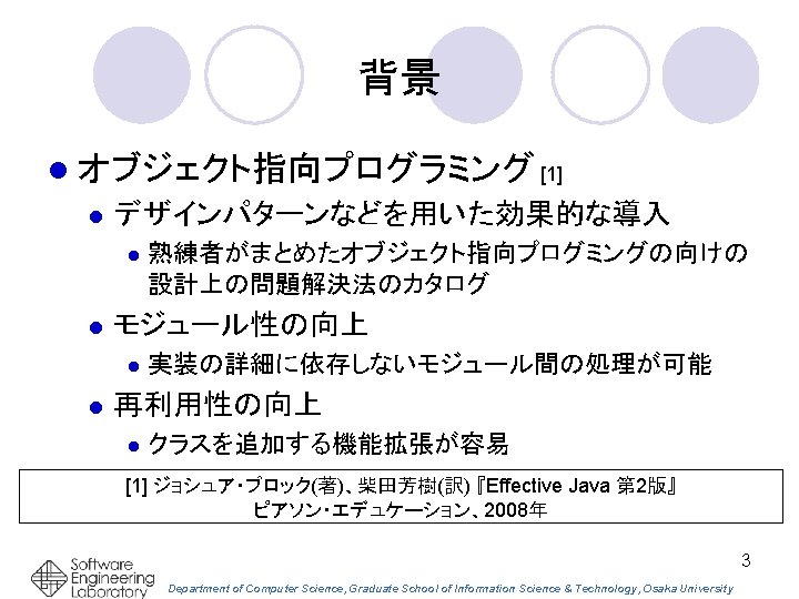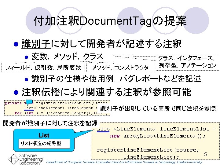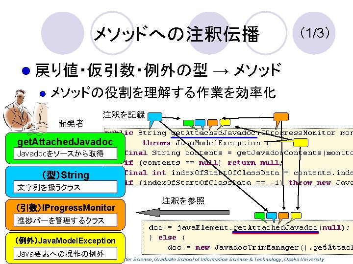 プログラム理解のための 付加注釈 Document. Tag の提案 ○田中昌弘,石尾隆,井上克郎(大阪大) Department of Computer Science, Graduate School of Information Science & Technology, Osaka University 1