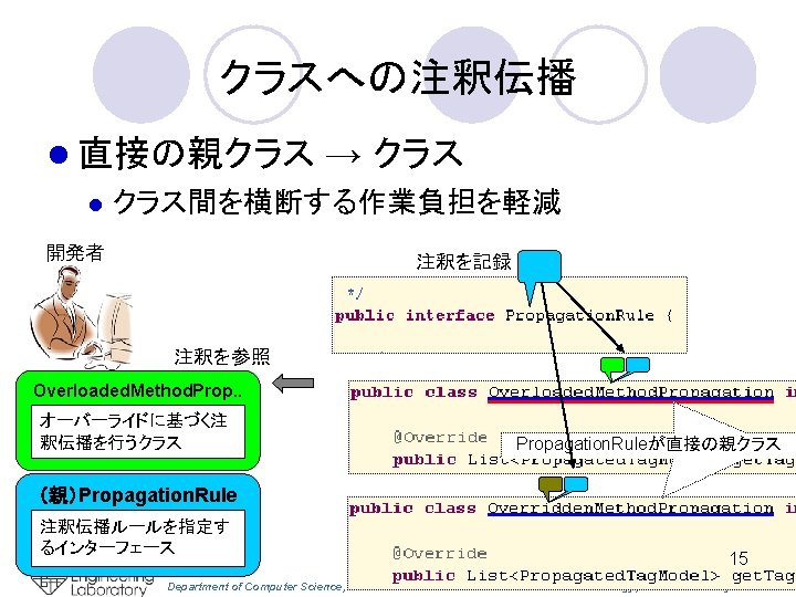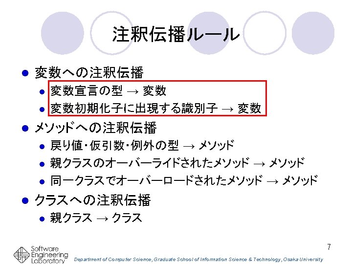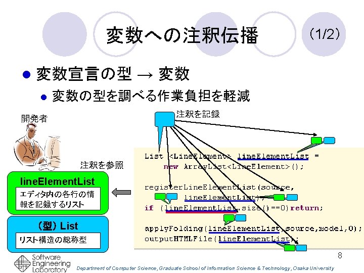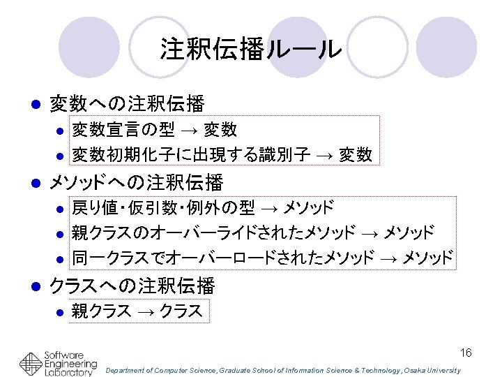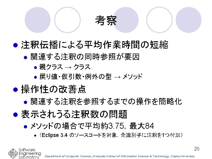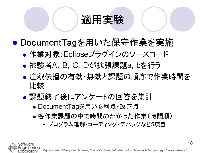 Eclipseプラグインとして実装 エディタ上でカーソル位置に ある識別子の注釈 関連する注釈を同時 に参照できる 17 Department of Computer Science, Graduate School of Information Science & Technology, Osaka University