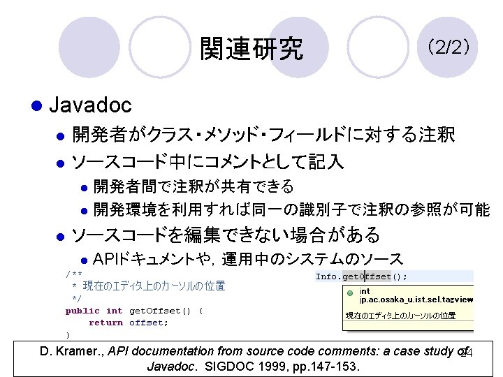 関連研究 (1/2) l ソースコード上の移動を支援 開発者が注釈を記入 一覧に登録される 23 M. -A. Storey et al. , How Programmers can Turn Comments into Waypoints for Code Department of. Navigation. Computer Science, ICSM Graduate School of Information Science & Technology, Osaka University 2007, pp. 265 -274.
