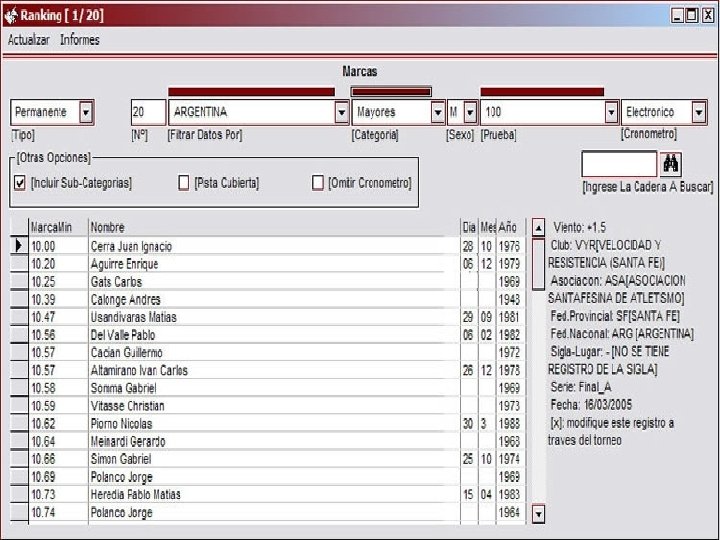 Documentación de evaluación (memoria) En carreras de 200 m. o menos, el reporte de velocidad del viento u En competencias de clasificación “A”, los resultados de eventos de campo contendrán los registros de cada intento de los atletas. u