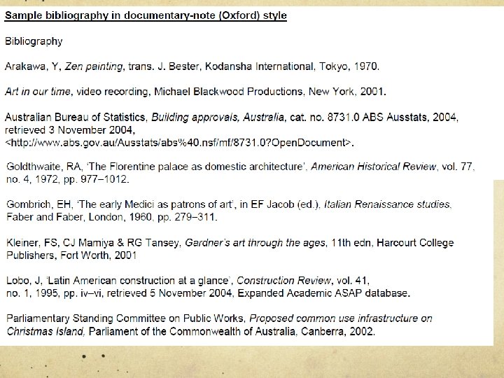 Bibliography A bibliography consists of sources cited in text, sources consulted in preparing a paper, as well as other sources thought to be of use or interest to the reader. A reference list consists of only the sources cited in a paper. Note, however, that the term ‘bibliography’ is sometimes used for what would more accurately be called a reference list. In compiling entries for a bibliography (and for a reference list) according to the documentary note style, note that the order of elements, the punctuation and capitalisation are the same as for footnotes/endnotes.