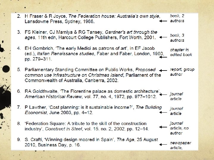 Secondary Sometimes you may read one author (secondary, e. g. Sources Brown below) who cites another author (primary, i. e. Smith), and you want to use what the primary author has said. You should cite the primary author using a superscript number in the ways already discussed. However, the footnote should list both sources, as follows: 10. A Smith, Italian architecture, Penguin, Melbourne, 2000, cited in D Brown, Renaissance Italy, Faber and Faber, London, 2002, p. 45.