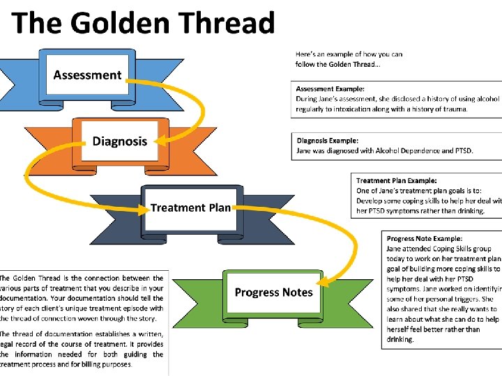 Documenting your one-to-one focusing on goals • Progress notes tell a client’s treatment story and give the clinician credit for the incredible work that happens in a treatment setting. • All Progress Notes must include: • 1. The topic of the session • 2. A description of the client’s progress on treatment plan challenges, goals, action steps, objectives and/or referrals • 3. Information on the client’s attendance • 4. Information on EBP’s that you used with client