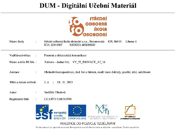 • OTÁZKY pro ústní nebo písemné vypracování • 1. Vysvětlete rozdíl mezi dodacím listem a fakturou? • 2. Jaký význam má dodací list a proč? • 3. Vyjmenujte náležitosti dodacího listu? • 4. Způsoby odeslání dodacího listu? • 5. Který z dokladů Faktura – Dodací list , je daňovým dokladem? • 6. Kdy a ve kterých případech se používají předtisky dokladů? • 7. Účel fakturace a k čemu slouží? • 8. Jaké jsou náležitosti faktury? • 9. Ve kterých případech se musí uvést cena s DPH a bez DPH? • 10. Jaké je číslování faktur a jejich platnost?