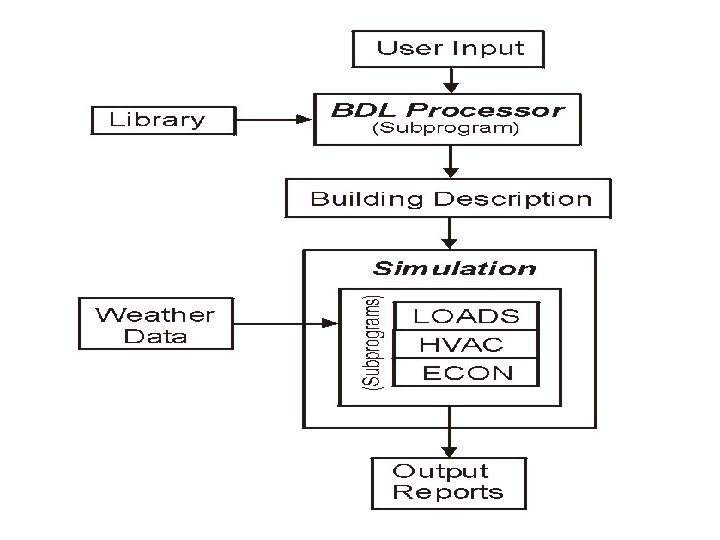 Background Based on transfer function theory & weighting factor method; in FORTRAN language p Program structure p n Building description language (BDL) processor p n Error diagnosis & calculate response factors Simulation subprograms LOADS – building loads p SYSTEMS – secondary HVAC system p PLANT – primary HVAC system p ECONOMICS – economic analysis p