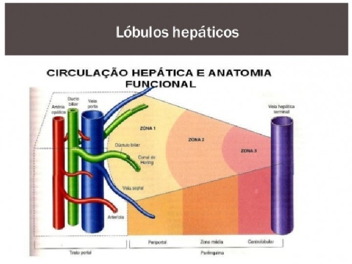 LIVER: órgão extremamente vascularizado pelo qual passa 25% do sangue bombeado pelo coração. O fluxo sanguíneo penetra através do hilo hepático, pela veia porta que transporta sangue rico em nutrientes e pobre em oxigénio vindo do trato digestivo, do pâncreas e do baço, e pela artéria hepática que fornece o fígado em sangue oxigenado proveniente do tronco celíaco da artéria abdominal. O sangue proveniente dessas duas vias (artéria hepática e veia porta) é libertado nos sinusoides, onde se mistura e é tratado pelos hepatócitos, saindo do fígado pela veia cava inferior em direção ao átrio direito do coração. Por outro lado, a bile sintetizada pelos hepatócitos é transportada através dos ductos hepáticos e lançada na vesícula biliar para a sua concentração e armazenamento. A organização microscópica do parênquima hepático é em unidade conhecida como ácino ou lóbulo. Um lóbulo consta de uma veia hepática central terminal rodeada por quatro a seis tríades portais terminais, formando uma unidade poligonal. Entre a tríade porta terminal e a veia hepática central, existem três zonas que se diferenciam em sua composição enzimática e exposição aos nutrientes e ao sangue oxigenado. Em geral, as zonas 1 a 3 rumam da tríade portal terminal em direção à vênula hepática central. Zona 1 (periportal): ambiente rico em nutrientes e oxigénio. Zonas 2 (intermediária) e 3 (perivenular): ambientes menos ricos em oxigénio e nutrientes. As células das várias zonas diferem-se enzimaticamente e respondem de modo diverso à exposição a toxinas e à hipóxia. Esta disposição anatômica também explica o fenómeno da necrose centro lobular decorrente da hipotensão, com a zona 3 sendo a mais suscetível à diminuição da liberação de oxigênio.