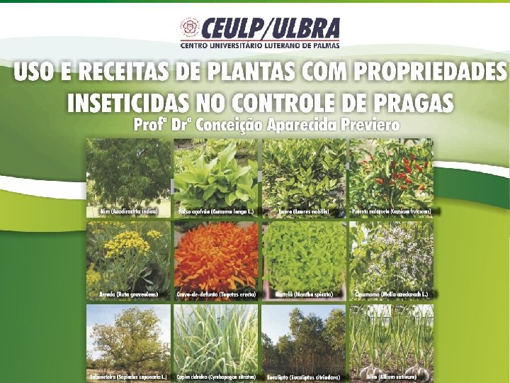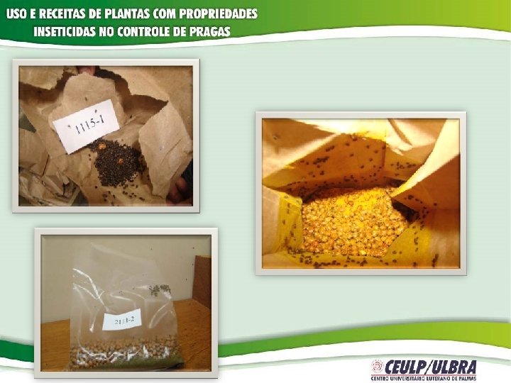 Nim (Azadirachta indica) Princípios ativos: azadiractina, meliantrol, salanina, além de vilasinina. O conjunto dessas substâncias e a ação específica de cada uma delas em separado produzem diferentes efeitos sobre os insetos, como repelência, esterilidade, desorientação na oviposição, efeito letal, regulador do crescimento, entre outros. Receitas - Neem utilizadas na conservação de grãos e sementes Ingredientes • 5 g de folhas de neem secas e moídas • 1 Kg de grãos Modo de preparo Secar as folhas a sombra. Misturar as folhas secas e moídas com os grãos e armazenar em embalagem impermeável.