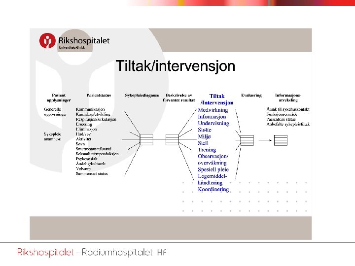 Pilotprosjekt ved Rikshospitalet Bakgrunn: Tilnærmet papirløst sykehus i løpet av 2007 Hensikt: Teste elektronisk mal for dokumentasjon av operasjonssykepleie Metode: • Utvikling av notatmal etter VIPS-modellen • Opplæring ved bruk av testpasient • 17 operasjonssykepleiere dokumenterte på 4 -6 pasienter hver • Observasjonsnotater under dokumentasjonen • Fokusgruppeintervju – 2 grupper