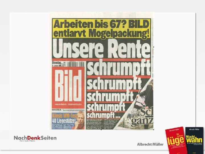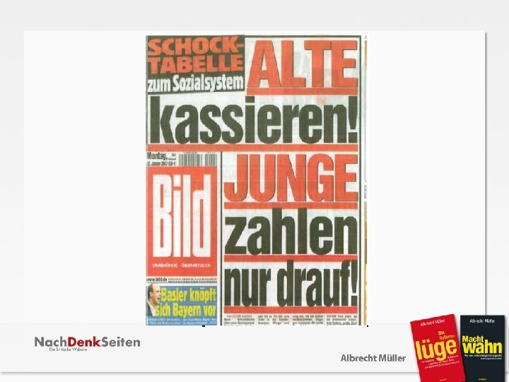 Die Bild-Zeitung hatte mit der Allianz Versicherung AG vereinbart, dass sie auch im redaktionellen Teil für das Privatvorsorgeprodukt der Allianz, die Volks-Rente, und für die Privatvorsorge insgesamt werben wird. Das schloss ein, den demographischen Wandel zu dramatisieren und den Verlust des Vertrauens in die Gesetzliche Rente zu forcieren: