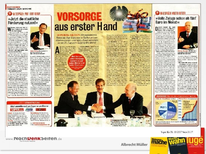 Agitation auf allen Kanälen • Sogar die Deutsche Rentenversicherung macht Propaganda für Privatvorsorge • Auch Finanztest • Und die Volkshochschulen • Und die Schulen • Die Banken, Versicherungen und Finanzdienstleister sowieso. • Und quasi alle Medien • Eine Auswahl: