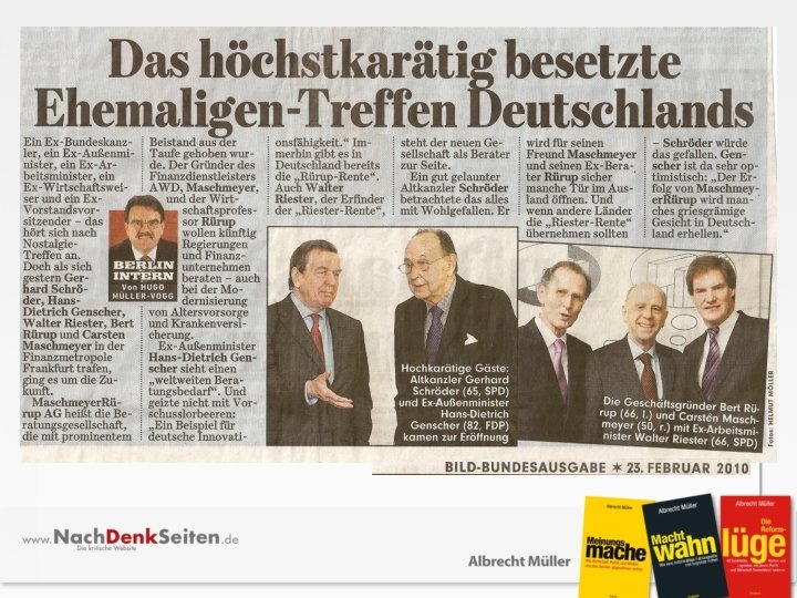 Im folgenden Artikel feiert die Bild-Zeitung die Paten. Es ist ein Artikel über die Gründung der Maschmeyer. Rürup AG. Mit dabei Hans-Dietrich Genscher und Gerhard Schröder. Und gefeiert vom Journalisten Müller-Vogg. Das ist nur ein Ausschnitt der insgesamt tätigen Lobby inklusive vieler Journalisten.