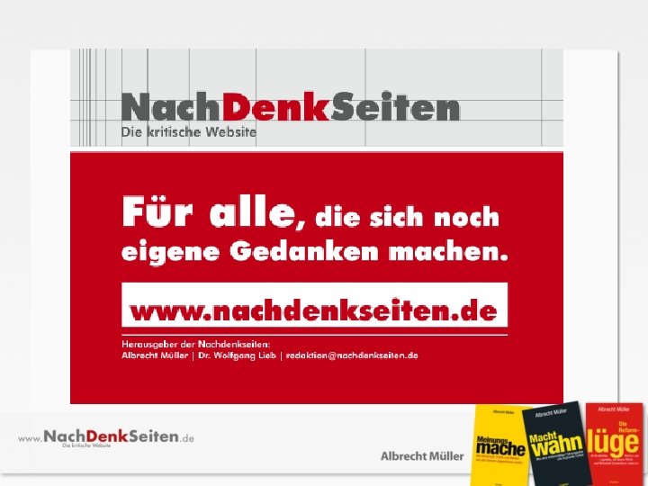 Warum finden Sie eine solche Aufklärung nicht bei den Medien? Wenn diese ihre Glaubwürdigkeitskrise überwinden wollen, dann müssen sie sich um die Sorgen der Menschen kümmern und vor allem wieder richtig informieren und sich aus der Umklammerung der Lobby und der großen Interessen befreien.