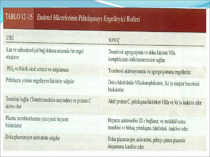 Normal damar sisteminde pıhtılaşmanın önlenmesi (intravasküler antikoagülanlar) Endotel tabakasına bağlı faktörler Endotel tabakasının düzgünlüğü Glikokaliks tabakası Trombomodilin (endotel hücre reseptörü) trombini bağlayarak ortamdan uzaklaştırması Prostasiklin, nitrik oksit trombositlerin agregasyonunu engellemesi Endotel hücrelerinden salınan doku faktörü yolu inhibitörü doku faktörü, faktör VII kompleksinin faktör X üretmesini engeller.