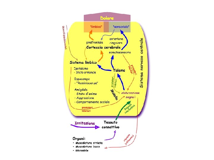 Forme ed eziologia dolore nocicettivo basato primordialmente sull'irritazione dei sensori di dolore (nocicettori) e trasmissione degli impulsi (tramissione di dolore) al sistema nervoso centrale dolore neuropatico in seguito a lesioni del sistema nervoso periferico o del sistema nervoso centrale (p. es. dopo amputazione, paraplegia, infezioni da herpes, polineuropatia diabetica). dolore funzionale in seguito a disturbi funzionali come: mal di schiena causato da impostura e movimenti abitudinali disfunzionali. Meccanismi psicosomatici e riflessivi vegetativi come: Attivazione del sistema neurovegetativo simpatico in stati di ansia Attivazione del sistema neurovegetativo parasimpatico in stati di depressione Aumento di tono muscolare in situazioni di stress emotivo Alcuni fattori psicosociali possono amplificare e/o cronificare dei dolori. Sono da prendere in considerazione nella terapia del dolore.