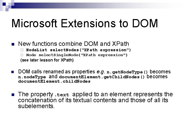 Microsoft Extensions to DOM n New functions combine DOM and XPath ¨ Node. List select. Nodes("XPath expression") ¨ Node select. Single. Node("XPath expression") (see later lesson for XPath) n DOM calls renamed as properties e. g. n. get. Node. Type() becomes n. node. Type and document. Element. get. Child. Nodes() becomes document. Element. child. Nodes n The property. text applied to an element represents the concatenation of its textual contents and those of all its subelements.