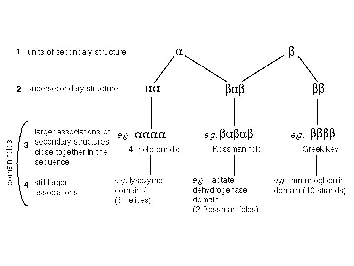 Between secondary and tertiary structure • Supersecondary structure: arrangement of elements of same or different secondary structure into motifs; a motif is usually not stable by itself. • Domains: A domain is an independent unit, usually stable by itself; it can comprise the whole protein or a part of the protein.