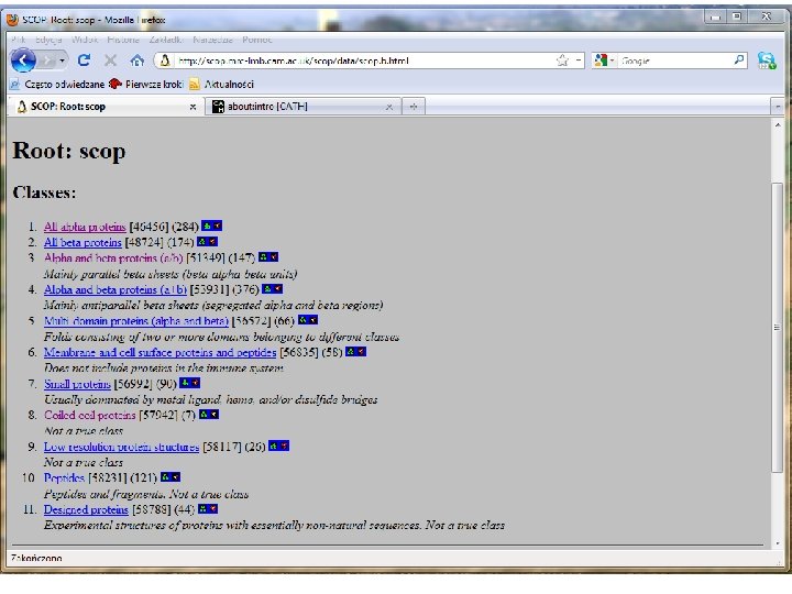 Scop Classification Statistics 1. 75 release 38221 PDB Entries (23 Feb 2009). 110800 Domains. 1 Literature Reference (excluding nucleic acids and theoretical models) SCOP: Class Structural Classification of Proteins. Number of folds superfamilies Number of families All alpha proteins 284 507 871 All beta proteins 174 354 742 147 244 803 376 552 1055 66 66 89 58 110 123 90 1195 129 1962 219 3902 Alpha and beta proteins (a/b) Alpha and beta proteins (a+b) Multi-domain proteins Membrane and cell surface proteins Small proteins Total