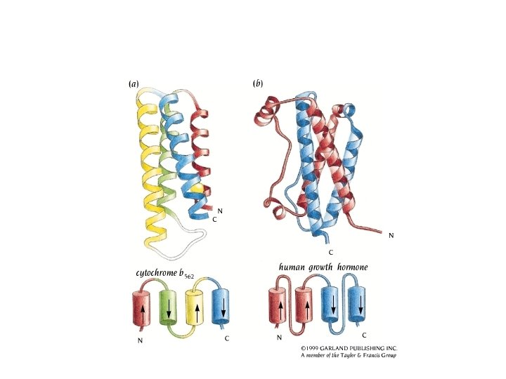 Classification of three-dimensional structures of protein Richardson’s classification a – a-helices are only or dominant secondary-structure elements (e. g. , ferritin, myoglobin) b – b-sheets are only or dominant elements (e. g. , lipocain) a/b – contain strongly interacting helices and sheets a+b – contain weakly interacting or separated helices and sheets