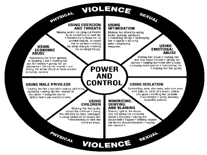 Types of Domestic Violence (continued) • Psychological/Emotional -Instilling or attempting to instill fear -Isolating or attempting to isolate from friends, family, school, work -Undermining or attempting to undermine victim’s sense of self-worth • Economic -Making or attempting to make the victim financially dependent -AIN, 1994